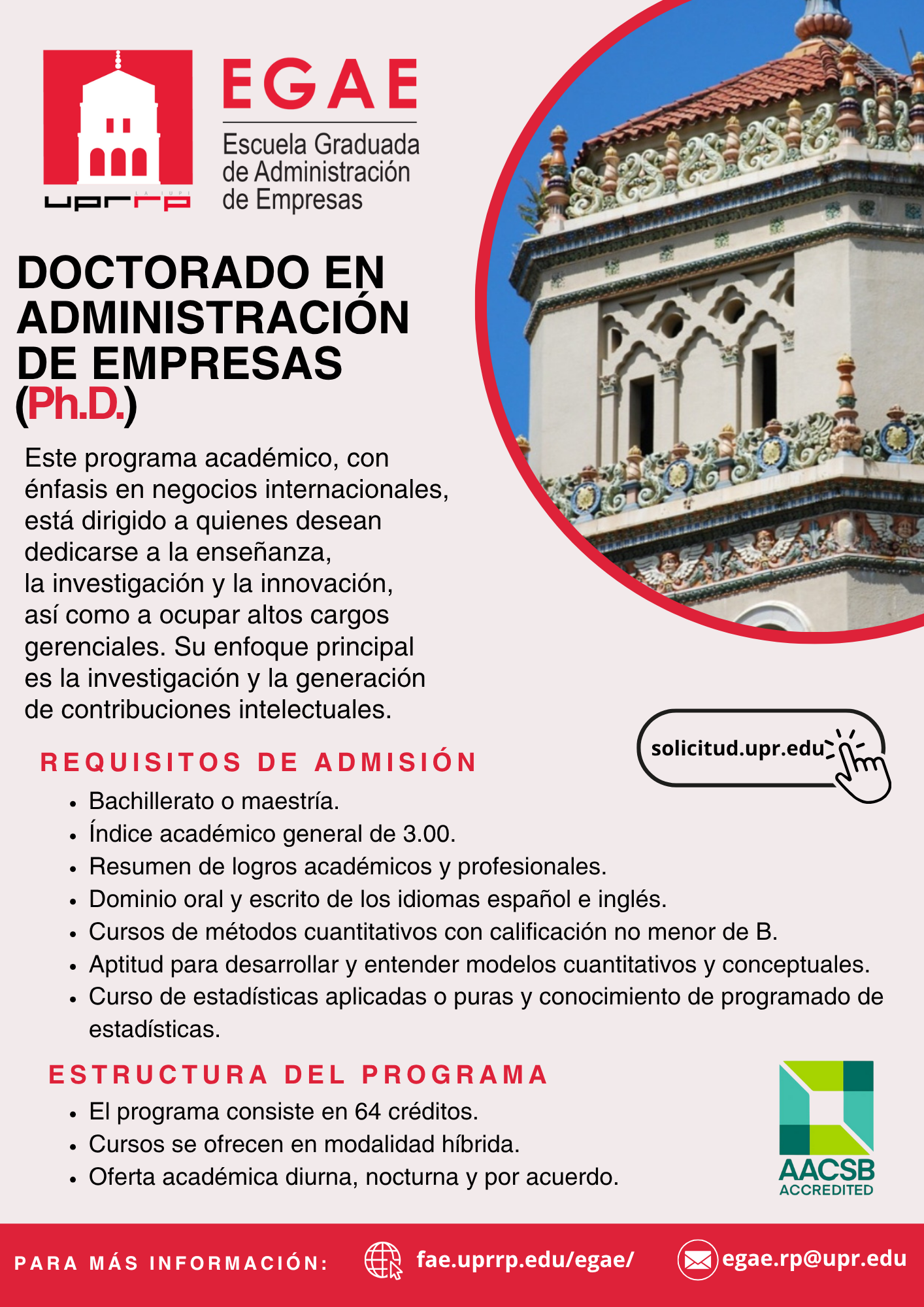 Es un programa que otorga un doctorado en Administración de Empresas con especialización en Negocios Internacionales. Está diseñado para satisfacer las necesidades de aquellos individuos que desean dedicarse a la enseñanza, la investigación e innovación creativa y a ejercer funciones gerenciales del más alto nivel. El programa tiene como énfasis la investigación y creación de contribuciones intelectuales y requiere como mínimo la creación de un artículo a publicarse en una conferencia académica.