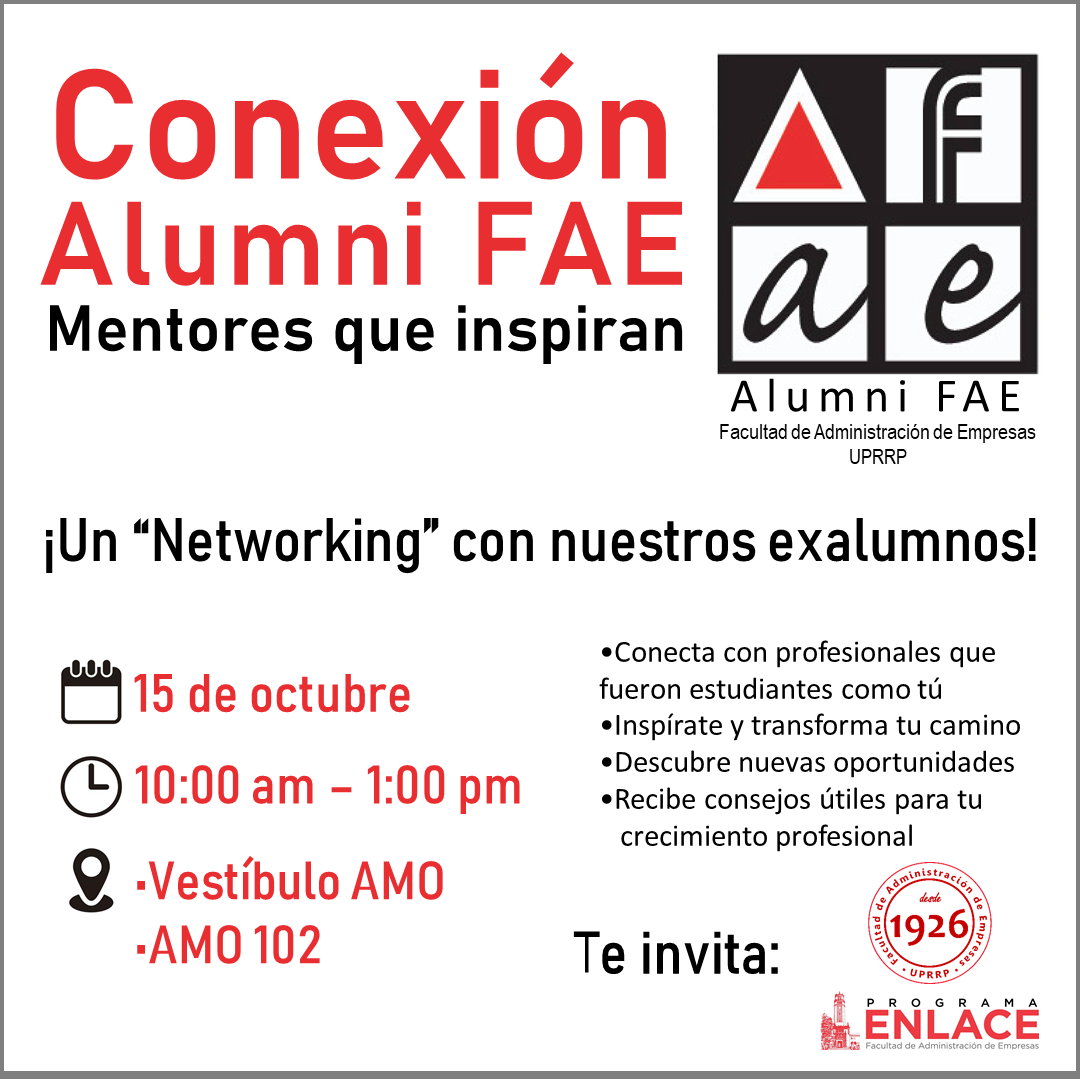 Conexión Alumni FAE: ¡Un “Networking” con nuestros exalumnos! Estudiante de la FAE ¡Participa de la última edición de este semestre de Conexión Alumni FAE! Edición especial Miércoles 15 de octubre de 2025 Lobby AMO 10:00 am a 1:00 pm Start Time 10:00 am October 15, 2025 Finish Time 1:00 pm October 15, 2025 Address Vestíbulo AMO Share: