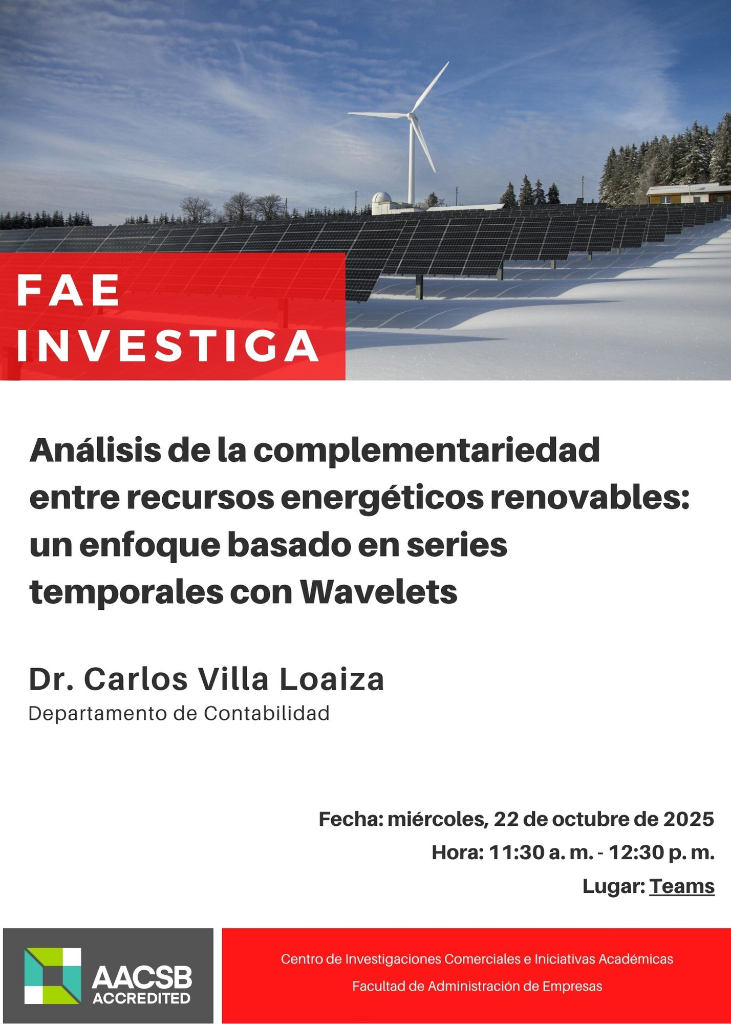 ¡Saludos a todos y a todas! Les invito a la segunda presentación de este año académico de la serie FAE investiga. El doctor Carlos Villa Loaiza, del Departamento de Contabilidad, compartirá su investigación Análisis de la complementariedad entre recursos energéticos renovables: un enfoque basado en series temporales con Wavelets.