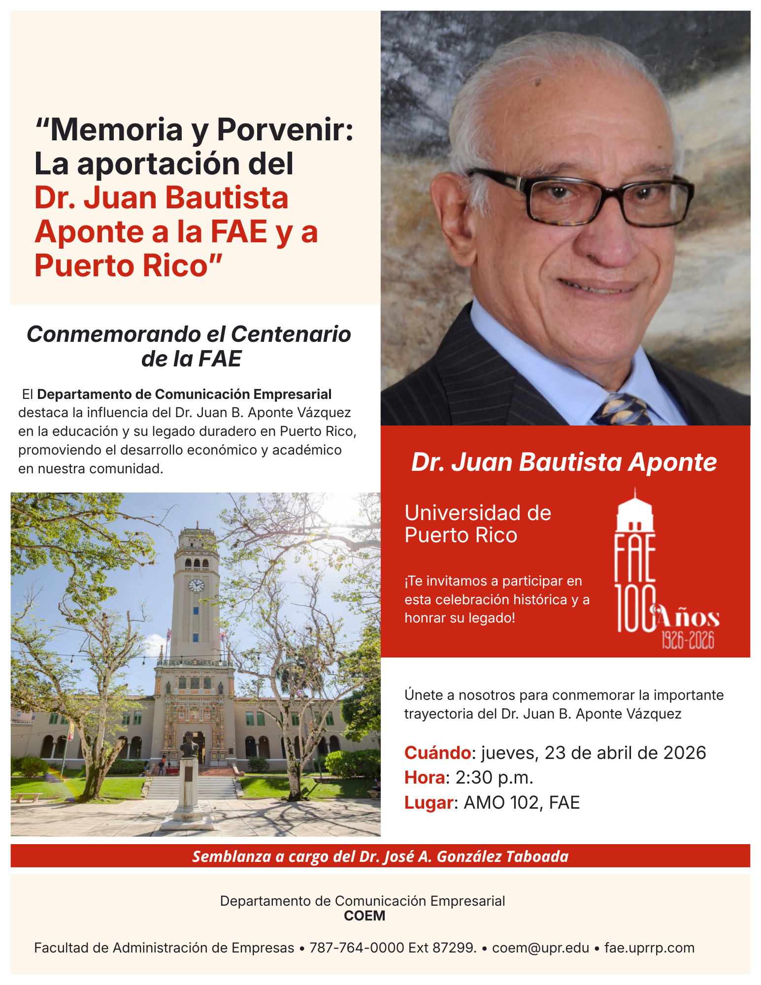 El Departamento de Comunicación Empresarial destaca la influencia del Dr. Juan B. Aponte Vázquez en la educación y su legado duradero en Puerto Rico, promoviendo el desarrollo económico y académico en nuestra comunidad.